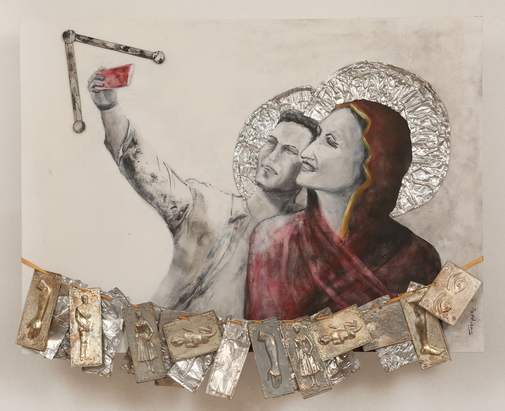 Ο πίνακας με τίτλο: «Ανάθεμα, τάμα, like», συνδέει την παραδοσιακή Ελλάδα με το σημερινό κόσμο των Μέσων Κοινωνικής Δικτύωσης. Ο συγκεκριμένος πίνακας εικονογραφεί με αρκετό χιούμορ ένα ζευγάρι (Παναγιά/ Χριστός) που βγάζει selfie φωτογραφία με ύφος ικανοποίησης, με αποτέλεσμα να αποκτήσουν φωτοστέφανο και τάματα στη θέση των συνηθισμένων like που μοιράζουν οι λάτρεις των ΜΜΕ σε ένδειξη αρεσκείας προς τους άλλους χρήστες. Αυτή η εκτροπή της παραδοσιακής αναπαράστασης της εικόνας της Παναγιάς και του Χριστού ή ενός απλού άνδρα; θέτει τις έξης ερωτήσεις. Σήμερα, μέχρι πού είμαστε ικανοί να φτάσουμε για να ικανοποιήσουμε το ναρκισσισμό μας, μέσω μιας selfie φωτογραφίας; Για τη δική μας προβολή, είμαστε έτοιμοι να αγνοήσουμε και ακόμα τον ιερό χαρακτήρα της Παναγιάς (κλασικό και λατρεμένο πρόσωπο της ορθόδοξης εκκλησίας); Ήρθε η ώρα να φλερτάρουμε με θεότητες για να πετύχουμε το σκοπό μας ή ακόμα εμείς, οι απλοί θνητοί πιστεύουμε ότι με μια selfie γίναμε οι ίδιοι θεότητες; Αυτό είναι κατόρθωμα ή ο ηρωισμός της εποχής μας ;