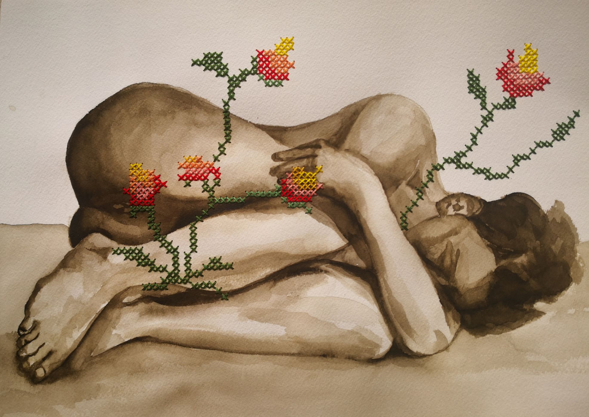Η Ελλάδα ως όμορφη γυναίκα κείτεται πληγωμένη και προσπαθεί να ανθίσει. Να ανθίσει με κεντίδια που έχουν γίνει με πραγματική βελόνα πάνω στο κορμί της.