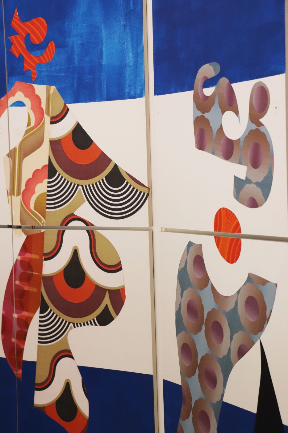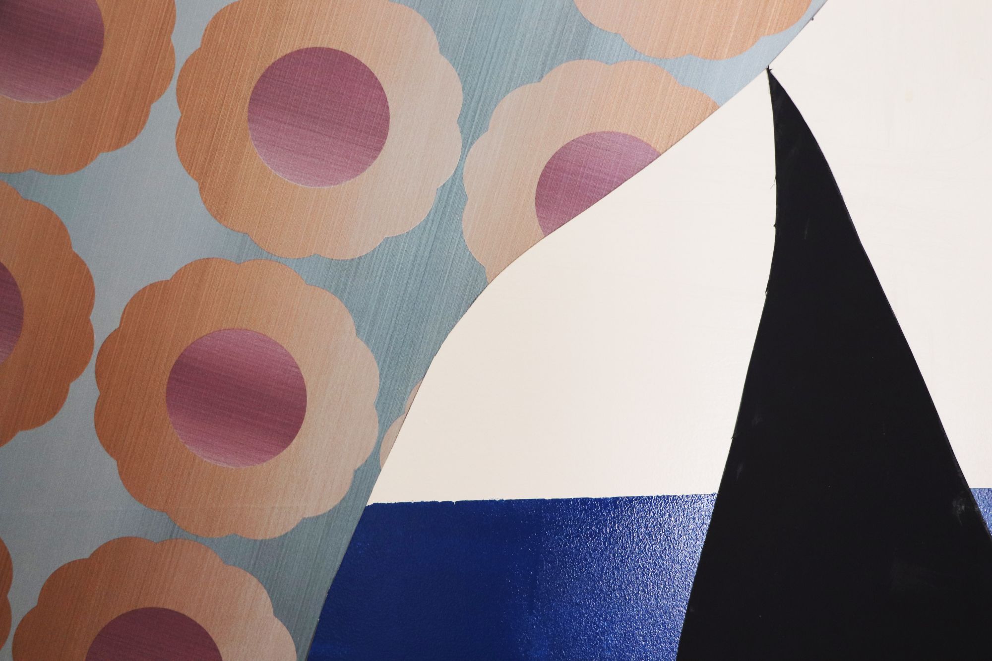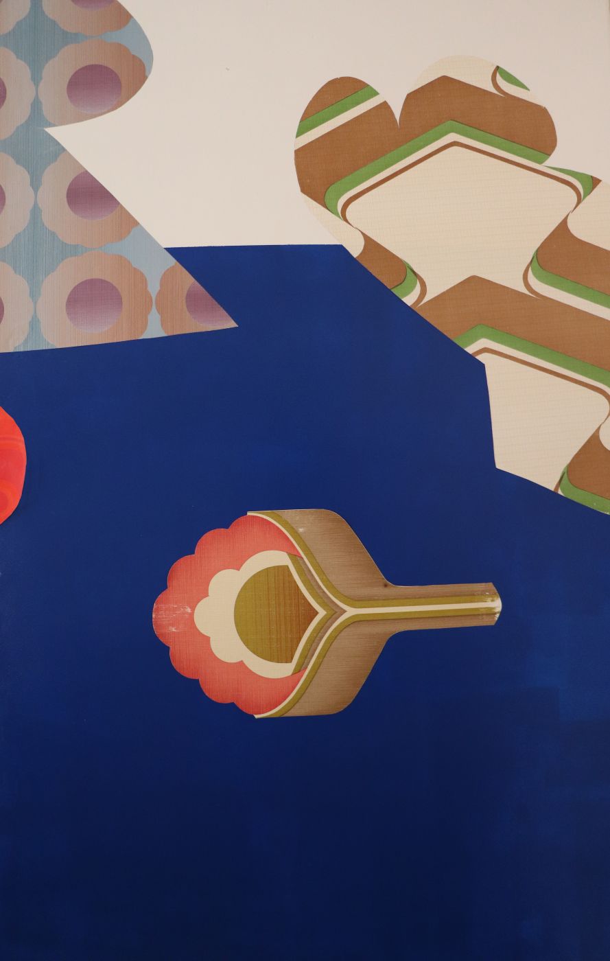 Ένας διακριτικός κυματισμός στην τοποθέτηση των πάνελ προσδίδει την αίσθηση της κίνησης. Το έργο αποτελείται από 12 ξύλινα πάνελ. Πρόκειται για επαναχρησιμοποιημένα φύλλα ντουλάπας, καθώς και χαρτιά ταπετσαρίας της δεκαετίας του ’60.