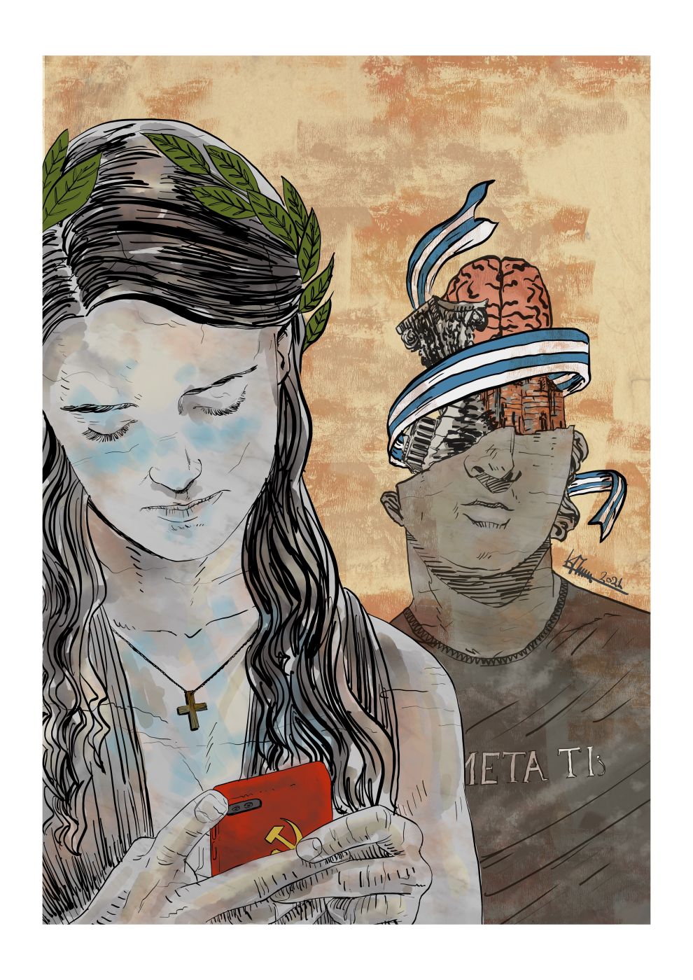 Απεικονίζεται η ιερή Ελλάς που αφήνει το ταίρι της, το κομμάτι που την συμπλήρωνε έως τότε και εξερευνεί τις καινούριες ιδέες που δεν της αρμόζουν.