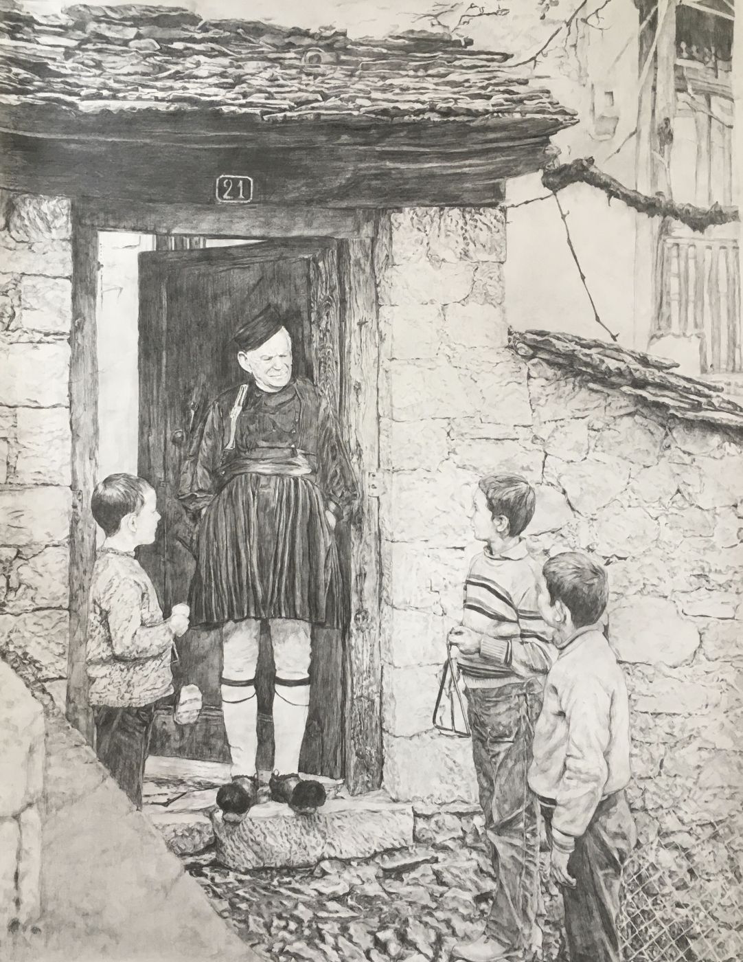 Ως εκ τούτου, σχεδίασα, από την οπτική γωνία ενός τρίτου παρατηρητή, παιδιά που επισκέπτονται έναν από τους προγόνους μας και του τραγουδούν τα κάλαντα της νέας χρονιάς. Ο παππούς τα καλοδέχεται με ανοιχτή την πόρτα του σπιτιού του, ώστε, αν θέλουν, να μπουν και να τον γνωρίσουν καλύτερα.