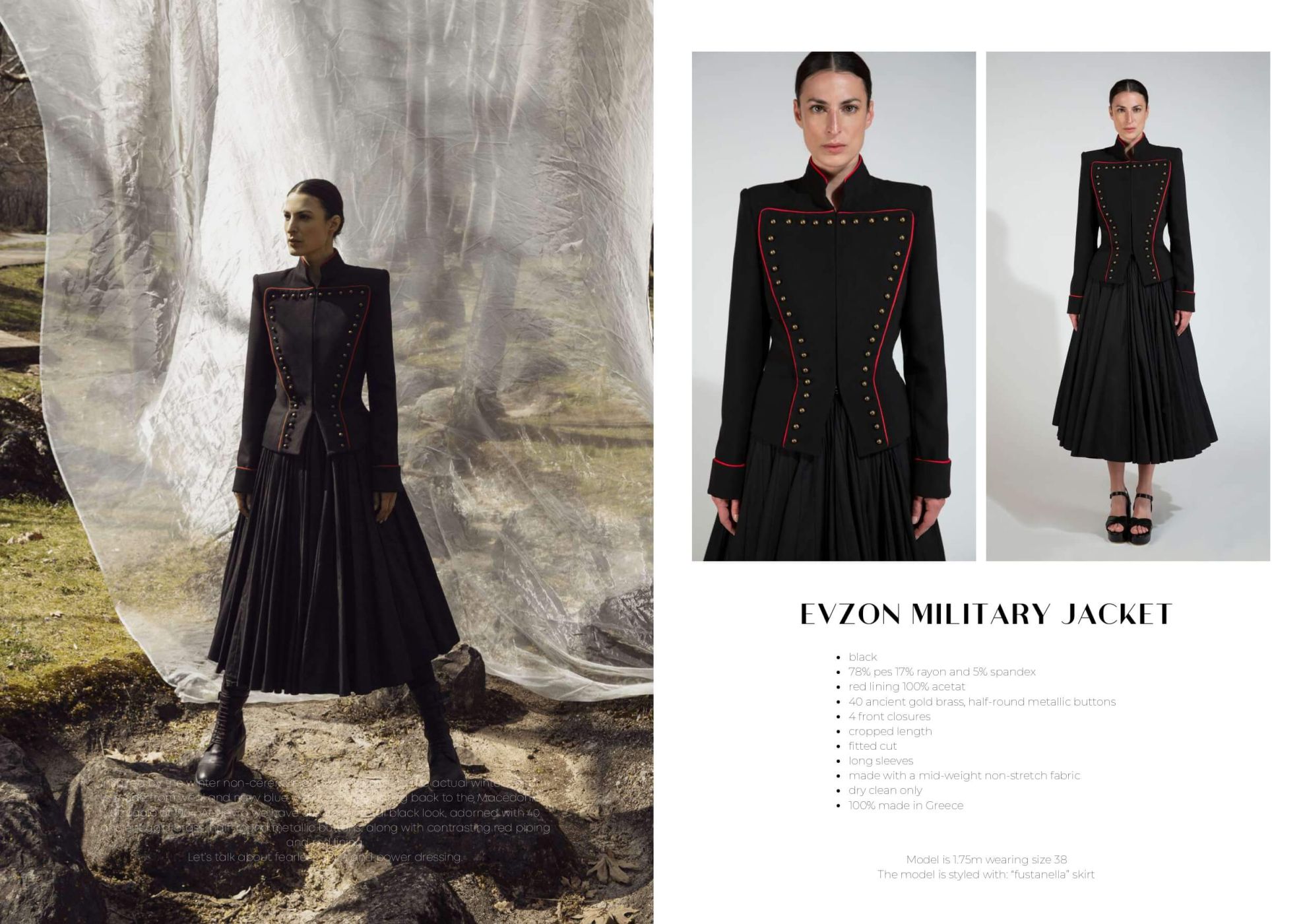 Το στρατιωτικό τζάκετ “Εύζωνες” είναι εμπνευσμένο από τη μη-τελετουργική χειμερινή στολή που φορούν οι Εύζωνες, τον μπλε Ντουλαμά που είναι η στολή του Μακεδονικού Αγώνα. Το Nevro military jacket είναι αντίστοιχα διακοσμημένο με 40 χρυσά μεταλλικά κουμπιά, κόκκινο ρέλι και κόκκινη φόδρα.