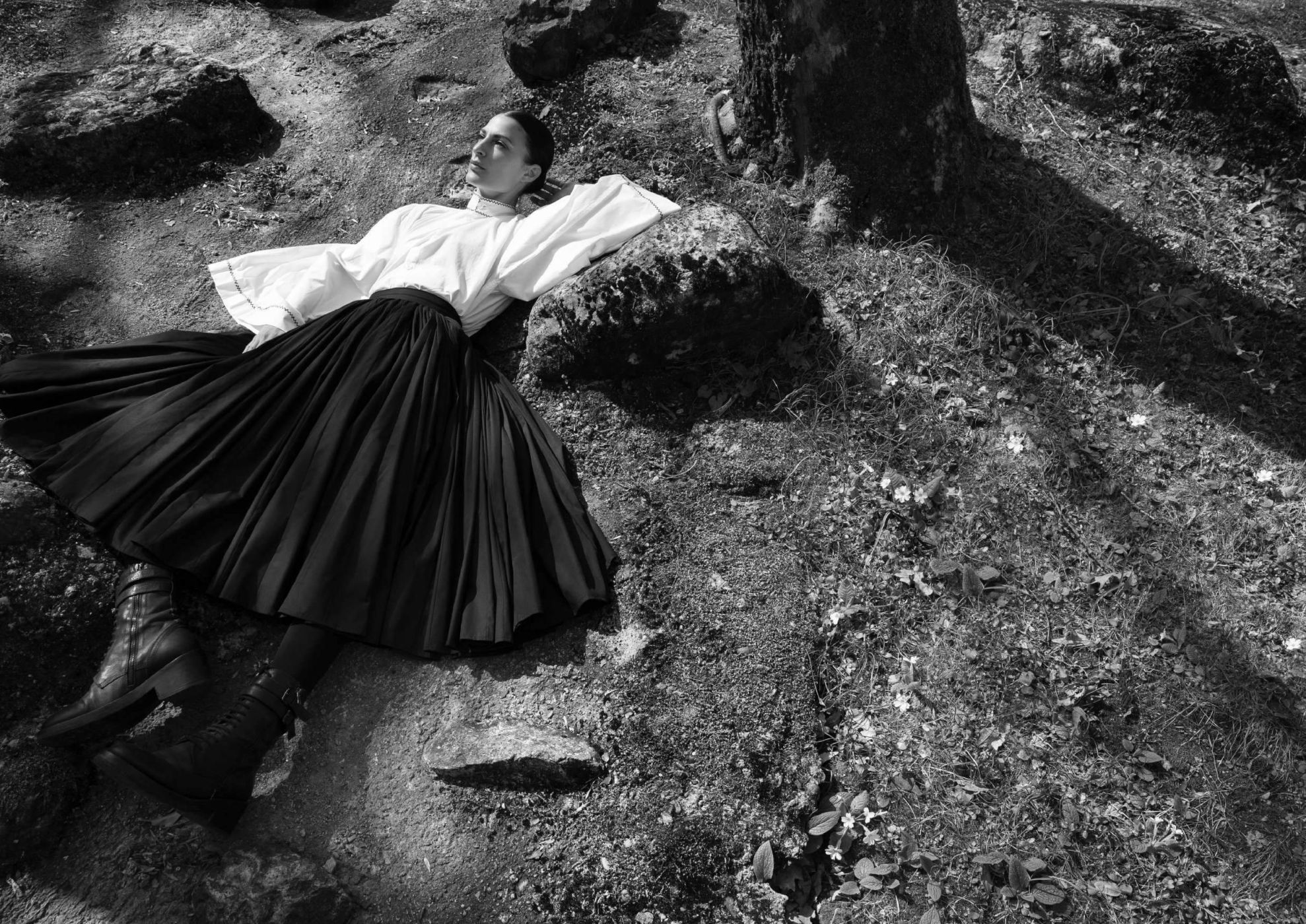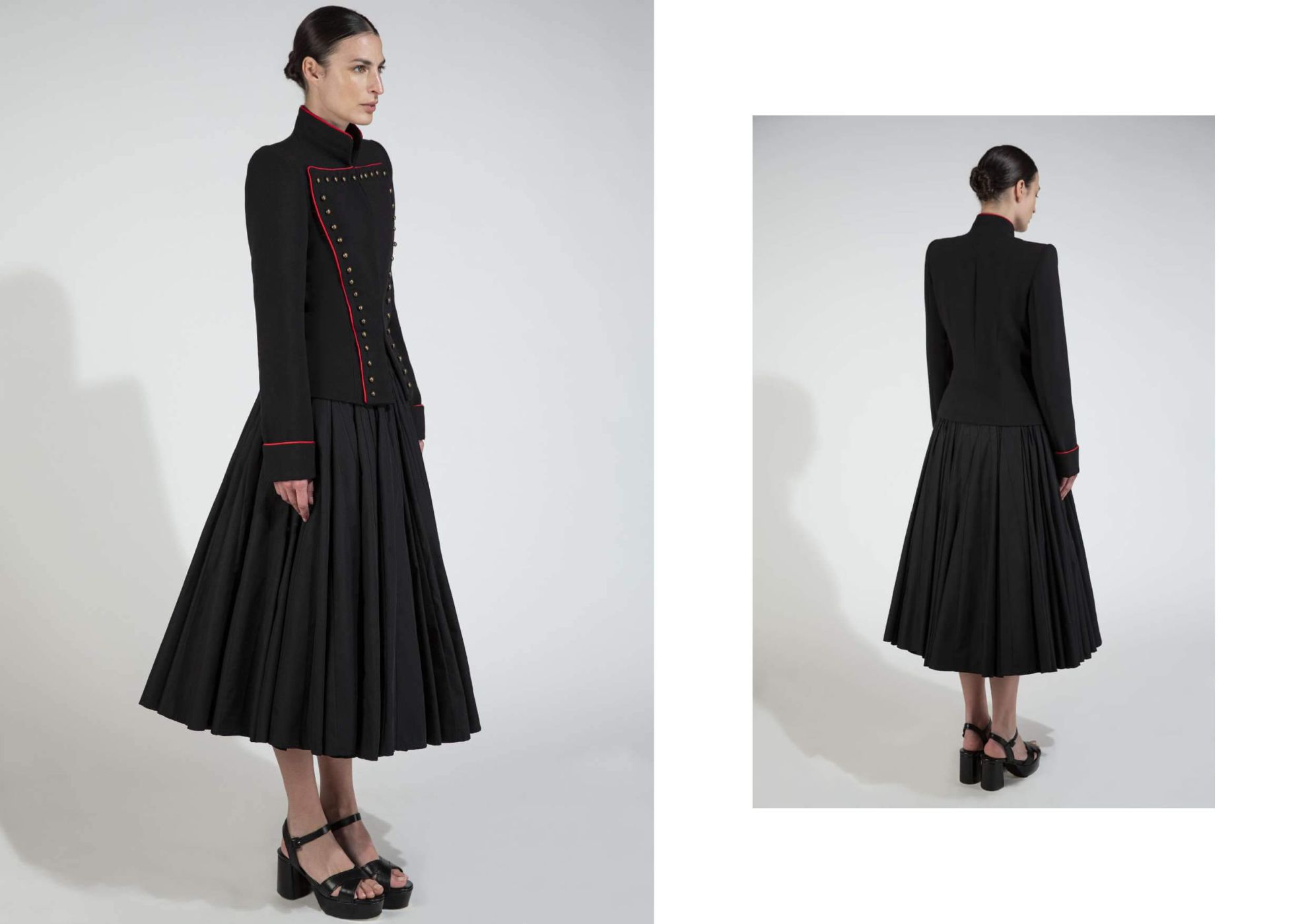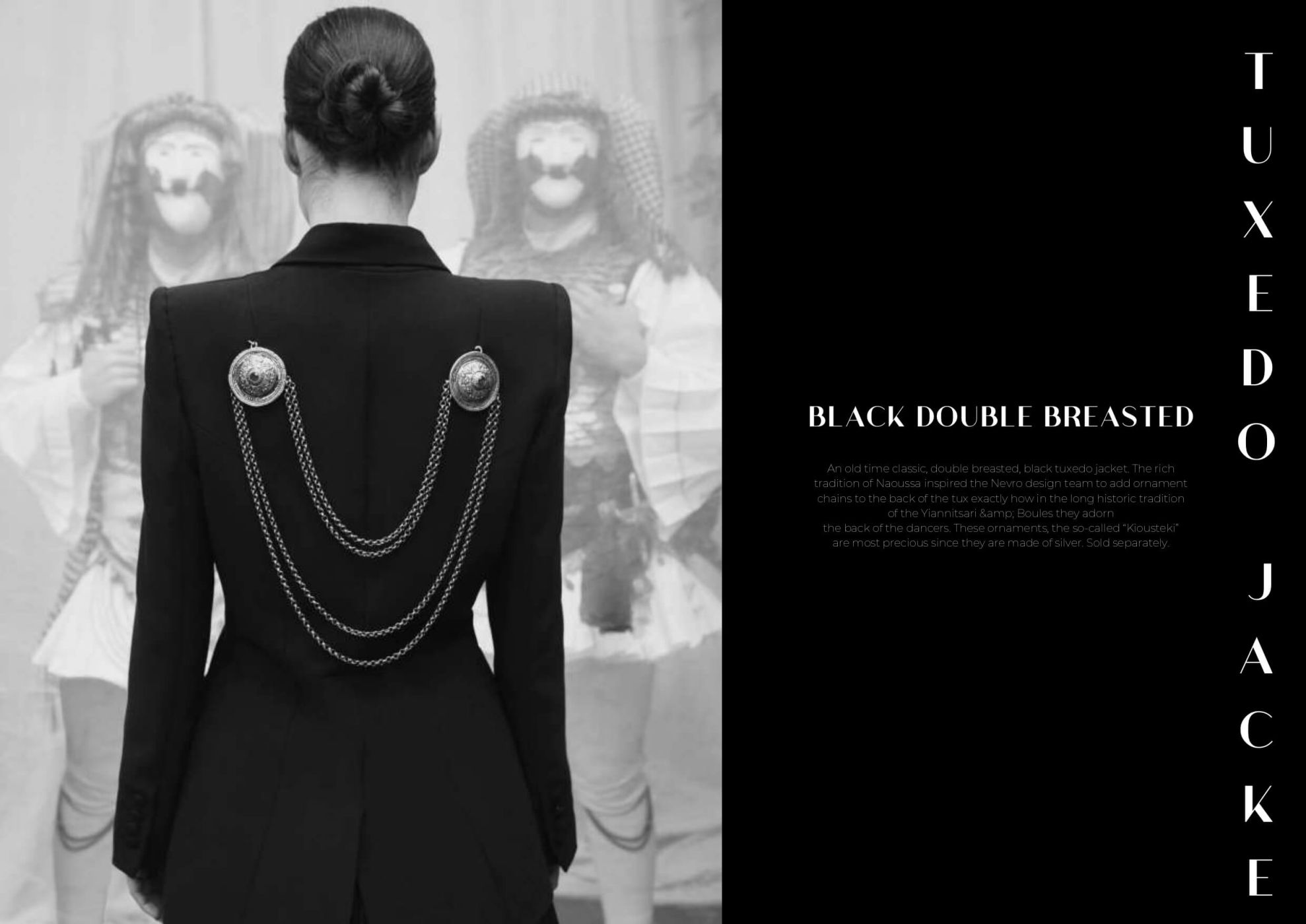 Το μαύρο σταυρωτό tuxedo τζάκετ είναι ένα επιβλητικά μινιμαλιστικό κομμάτι και η σχεδιαστική ομάδα εμπνεύστηκε από την πλούσια παράδοση της Νάουσας για να προσθέσει μια ενδιαφέρουσα διακοσμητική πινελιά – οι μεταλλικές αλυσίδες που στολίζουν την πλάτη του tuxedo τζάκετ είναι μία ωδή στο “Κιουστέκι”, τις παραδοσιακές ασημένιες αλυσίδες στην πλάτη των στολών που φορούν οι Γενίτσαροι και οι Μπούλες στο αποκριάτικο έθιμο. To «Κιουστέκι» πωλείται ξεχωριστά