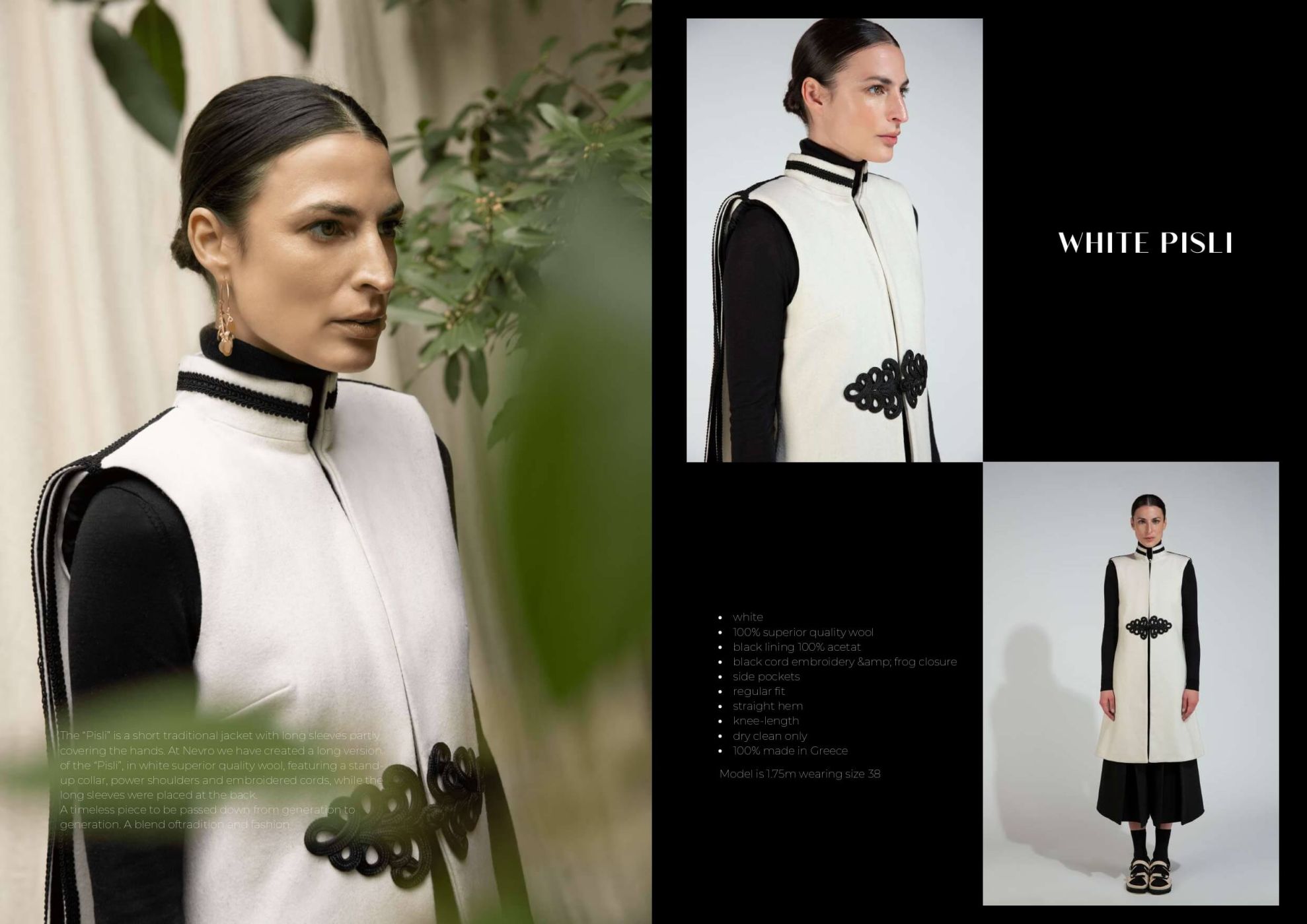 Το μακρύ γιλέκο “Πισλί” από 100% μαλλί υψηλής ποιότητας είναι εμπνευσμένο από το παραδοσιακό ομώνυμο γιλέκο με χαμηλό γιακά, δυναμικούς ώμους, κέντημα στη μέση και ελεύθερα μανίκια, αχρησιμοποίητα, που κρέμονται πίσω στην πλάτη. Το Nevro γιλέκο “Πισλί” υπάρχει σε λευκό και μαύρο και είναι ένα κομμάτι που θα περνάει από γενιά σε γενιά παραμένοντας διαχρονικά στη μόδα.